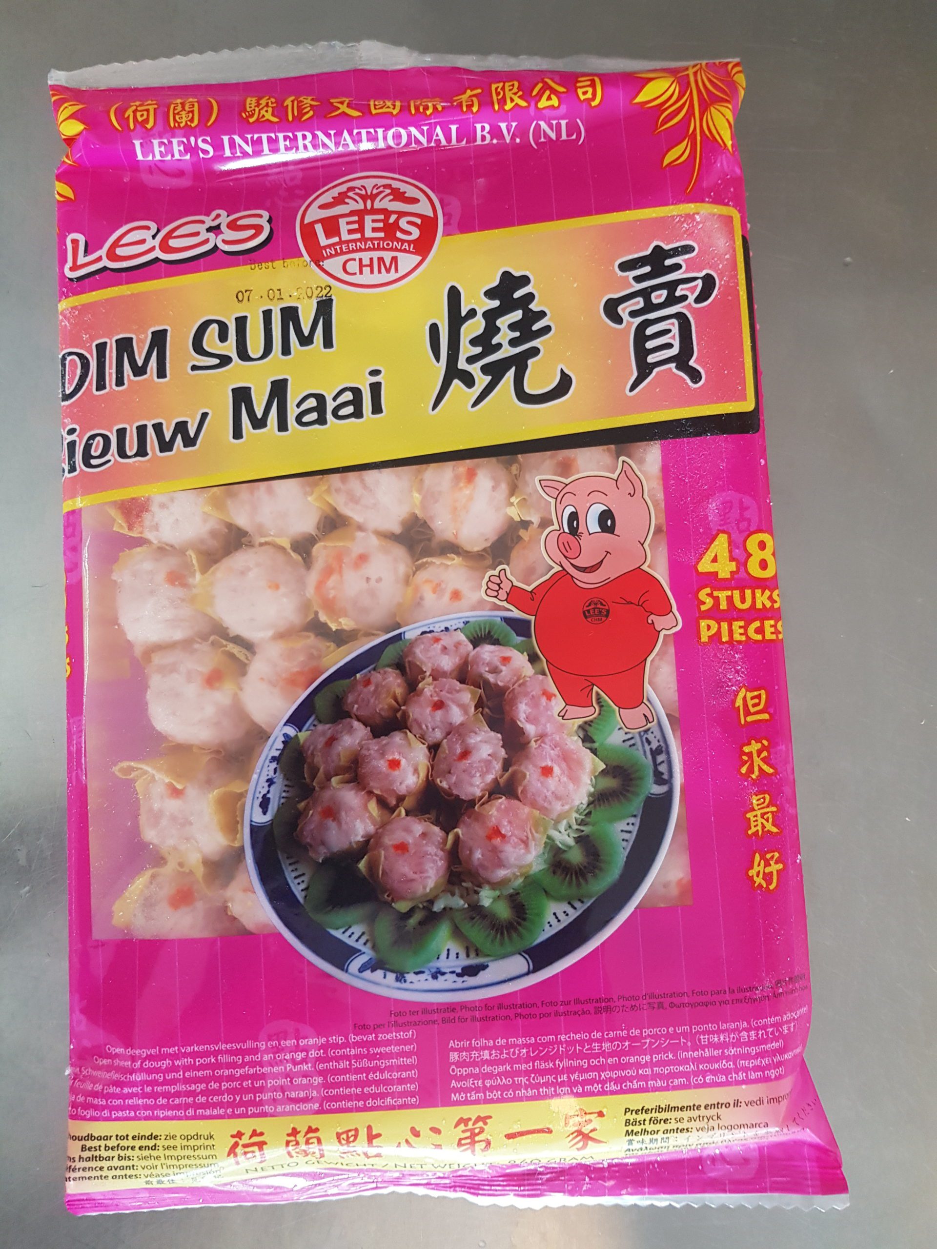 Deeg hapjes, met varkensvlees. Ontdooien niet nodig, 8 – 10 minuten in de frituur 180 graden.